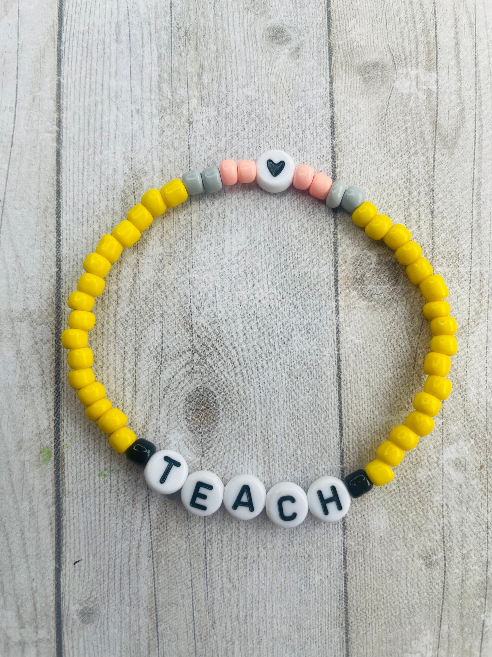Durable, beautiful beaded stretch bracelet. All bracelets are one size fits all (approx 7”) unless you specify needing a special size in the notes or a message to me. if you want the teacher’s name- choose “name” and in the notes section write the name you’d like.